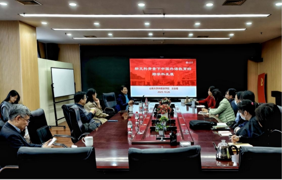 特邀教育部高等学校英语专业教学指导分委员会委员、山东省翻译协会会长、山东大学王俊菊教授做客学院,为学院师生作了题为“新文科背景下中国外语教育的跨学科发展”的学术讲座。报告由院长夏云主持,学院部分教师与研究生参加了本次活动。