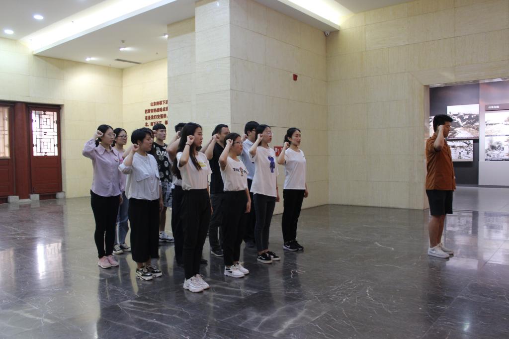 全体党员共同参观了位于莒南县大店镇的山东省政府和八路军115师司令部旧址。刘少奇、罗荣桓等老一辈革命家曾长期在此生活、工作和战斗过,纪念馆中陈列着山东省政府如何成立、如何发展的各类展品。丰富的实物和详实、系统的图文史料以及讲解员的生动讲解,再现了老一辈无产阶级革命家带领山东军民进行艰苦卓绝革命斗争的风采和功绩,深深地触动着大家的心灵,给在场党员实实在在地上了一堂爱国主义革命传统教育课。山东抗日根据地纪念馆内陈列的大量展品揭露了日军的暴行,再现了根据地军民同仇敌忾浴血奋战的恢宏历史画卷,使党员们深切缅怀了革命先辈为中华民族的解放事业做出的巨大贡献。在纪念馆内,全体党员面向鲜艳的党旗,高举右手庄严宣誓,重温入党誓词,表达自己要以实际行动为党旗增光添彩、为共产主义事业奋斗终身的决心。结束参观后,全体党员一同前往莒南县坊前镇胡家崖村进行志愿服务,将奉献精神付诸于实践之中,学生党员们将利用自身优势,密切联系群众,为胡家崖村的孩子们带去知识,为建设美丽乡村贡献自己的一份力量。