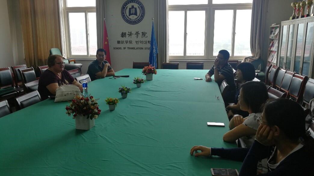 卢卫中院长首先对乔妮到来表示热烈欢迎。上个世纪八十年代中期,乔妮作为美国英语学会高级讲师远渡重洋来到中国,开启了她在中国28年的从教生涯。在我校任教的16年里,乔妮为本科生、硕士研究生、博士研究生开设了《英语口语》、《英语写作》、《美国文学》、《英国文学》、《英语国家概况》等十多门课程。在教学过程中,她注重对学生综合语言能力的培养,把美国先进教育理念引入到教学中,方法灵活、生动活泼,极大地推动了学生的专业成长。伊咏教授代表全体教师为乔妮献花,表达了对乔妮的关心与祝福。随后,老师们与乔妮共同探讨了有关专业教学以及中美教育对比与差异等方面的问题,双方收获颇丰。