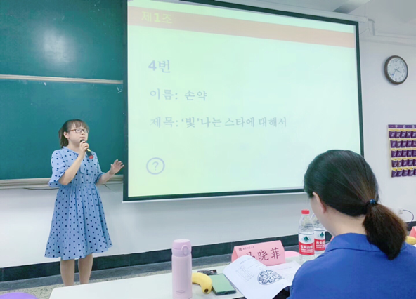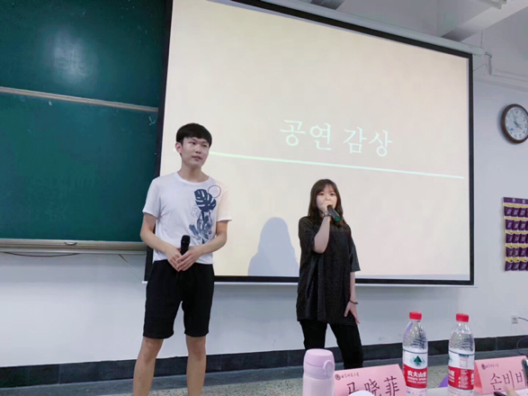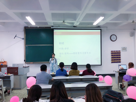 比赛伊始之前,金东国副教授对本次比赛发表致辞,表达对本次比赛的期待。比赛由定题演讲、即兴回答两部分组成。演讲主题涉及时事热点、韩国文化等,内容妙趣横生、丰富多彩。大三的同学们经过了三年的韩语学习,有着很强的语言实力,内容充实,发言流畅,竞争可谓非常激烈。在每一位同学韩语演讲结束后,评委老师进行即兴问答,同学不慌不忙地组织语言。参赛选手们稳定的发挥、机智的应答及出色的才艺展示给在场的所有观众留下了深刻印象,也为本次校园文化艺术节韩语相关活动锦上添花。
