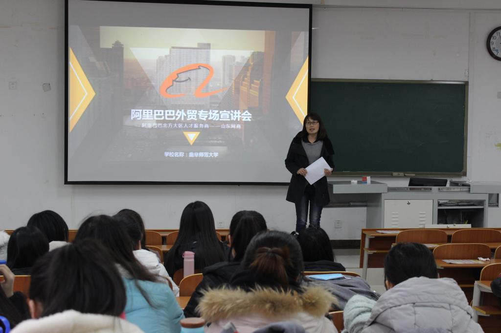 活动伊始,田艳艳老师向同学们介绍了由阿里巴巴人才输送第三方山东网商集团带来的120余家企业岗位的空缺信息与阿里巴巴百城千校百万英才计划,并讲述了阿里巴巴与外企的关系和工厂型外贸企业的优势,同学们对此表现出了高涨的热情。之后,秦慧娟老师对本次青岛站招聘企业的招聘岗位、招聘要求、工资待遇、就业安排作了详细的讲解,并介绍了岗前集训的安排与就业招聘流程。最后,宣讲会在同学们热烈的掌声中结束。