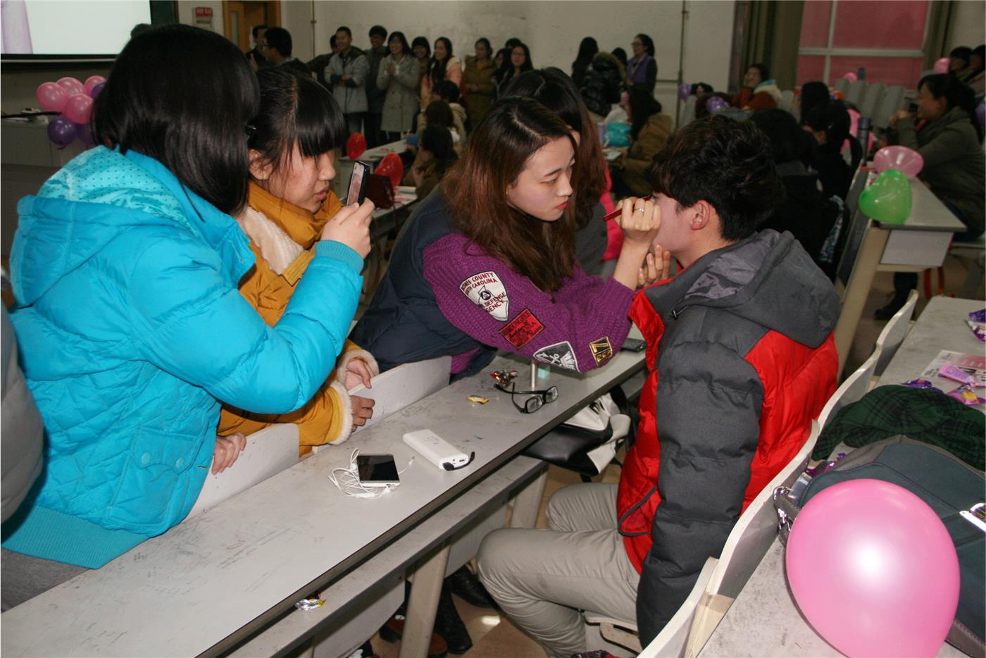 的马立锐同学为大家献上了搞笑而又不失精彩的舞蹈表演。而后进行的“现学现化”活动,即现场观众根据方才所学的化妆知识给男模特化妆,则将全场气氛推向高潮。伴随其而进行的“你来比划我来猜”游戏,选手们开动脑筋,拓展思维,许多生活化词语在搞笑夸张的动作下展现的栩栩如生,现场掌声、笑声不断。最后,大家对完成化妆的男模特们进行了现场评比,并选出了这次活动的“最美男生”。
