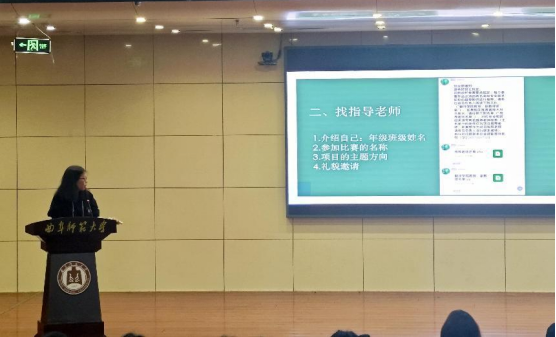 2022级商务英语一班的吴倩雯分享了自己的比赛经验和获奖经历,重点讲述了主题准备和项目撰写的注意事项。她表示,寻求老师的帮助对确定主题和开展深入研究具有重要意义,并提醒大家要规范使用文献,以确保学术研究的规范性和可靠性。