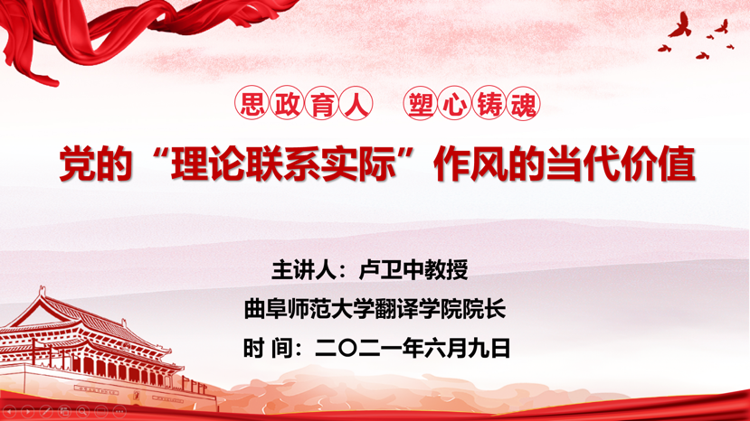 最后,卢院长结合“理论联系实际与个人工作、学习的关系”指出,当今世界面临百年未有之大变局,中国正处于两个一百年战略交汇点上,当代青年应树立远大的理想、担当时代之重任、勇于砥砺奋斗。我校作为一所有韧性、有睿性、有德性的大学,以学而不厌、诲人不倦的品格滋养一代又一代曲园人的心灵和精神。我院自建院以来,不断创新办学理念与人才培养模式,培养出一批又一批高素质、复合应用型、创新型、国际化专业外语人才和语言服务人才,因此,各位同学应在世界、国家、学校和学院定位之上,正确定位自己,勤学、强用、深悟、力行,理论联系实际,接过时代的接力棒,为实现中华民族伟大复兴的中国梦贡献自己的力量。