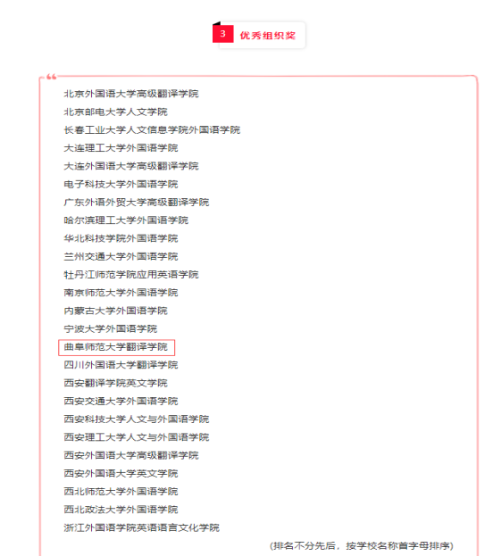 我院MTI专业研究生庄淑文同学荣获英译汉组三等奖,其导师卢卫中教授荣获优秀指导教师称号。另有多名MTI专业研究生同学荣获优秀奖。我院荣获优秀组织奖。
