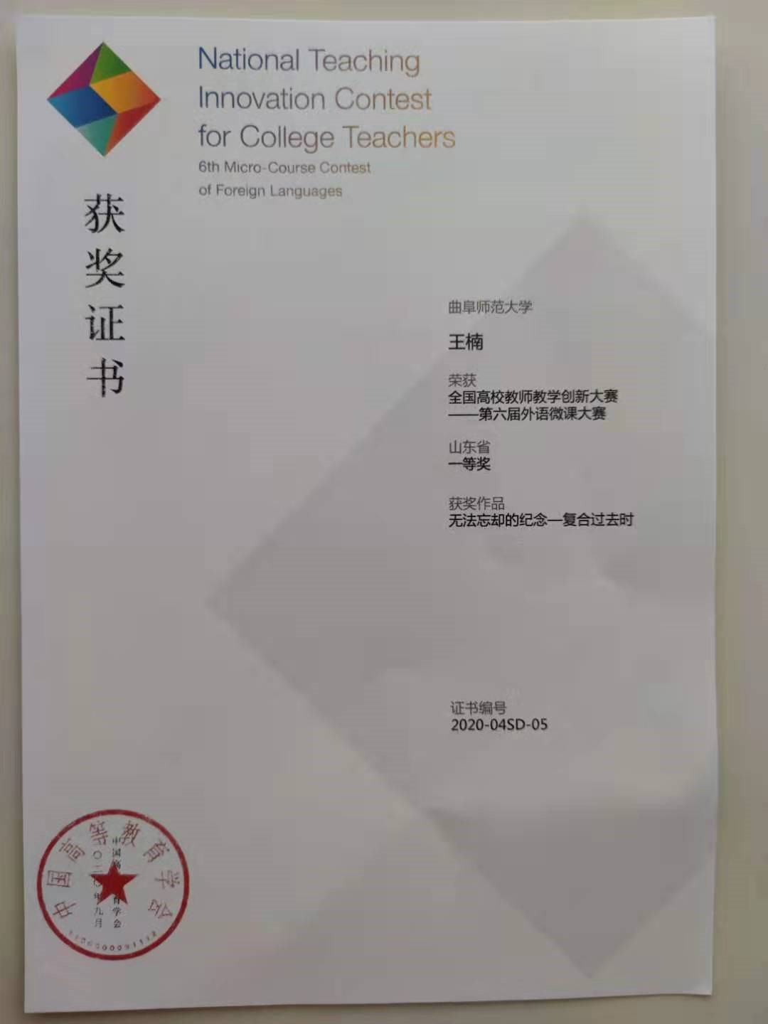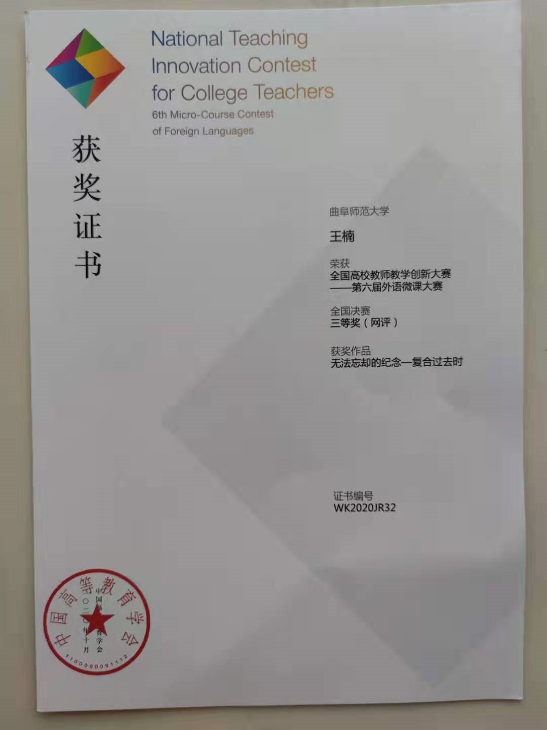 近日,全国高校教师教学创新大赛——第六届外语微课大赛顺利落下帷幕。本次大赛由中国高等教育学会与高等教育出版社和教育部高等学校大学外语教学指导委员会联合举办。我校色情动漫 教师王楠荣获山东省一等奖,全国决赛三等奖。这是王楠老师第二次荣获此殊荣。