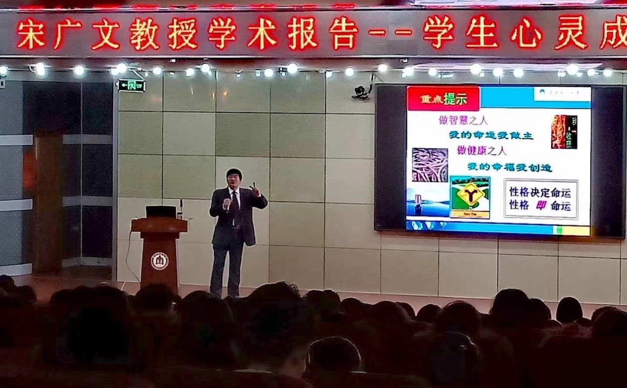 11月15日下午,华南理工大学心理学教授宋广文先生的学术报告会在图书馆报告厅隆重举行。报告的主题为“学生心灵成长与人生规划”。报告会由院长卢卫中教授主持,学院党委副书记董家忠、辅导员李凯、王峰出席,2019级和2018级全体本科生同学聆听了此次报告。