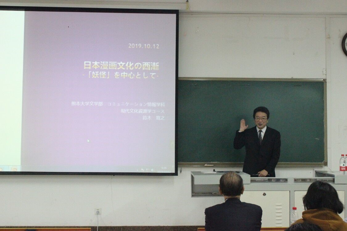 2019年10月12号上午9:30,日本熊本大学铃木宽之教授应邀来我院讲学,报告主题为日本漫画文化的国际传播。外教田畑千秋老师担任此次讲座的主持人,色情动漫