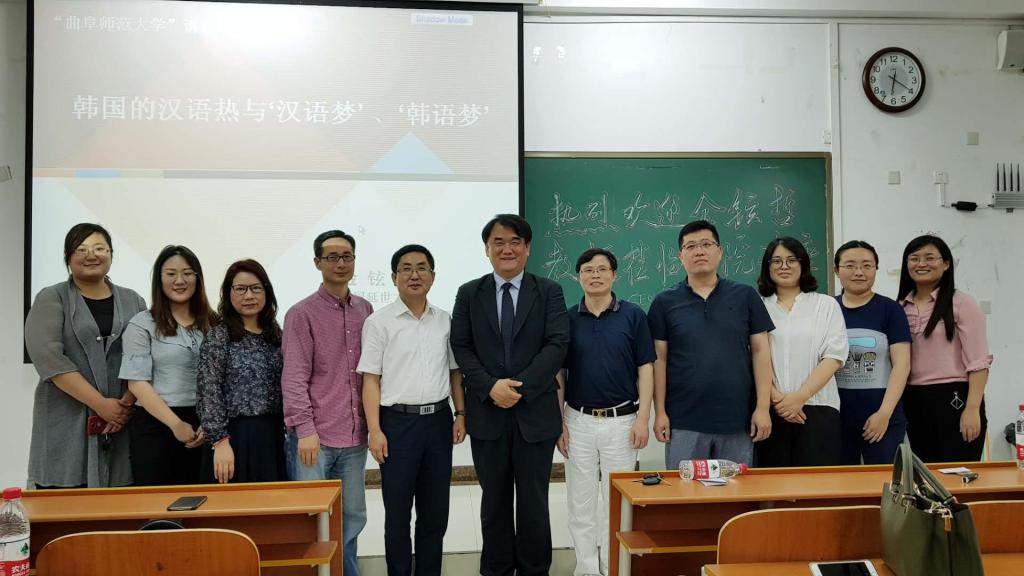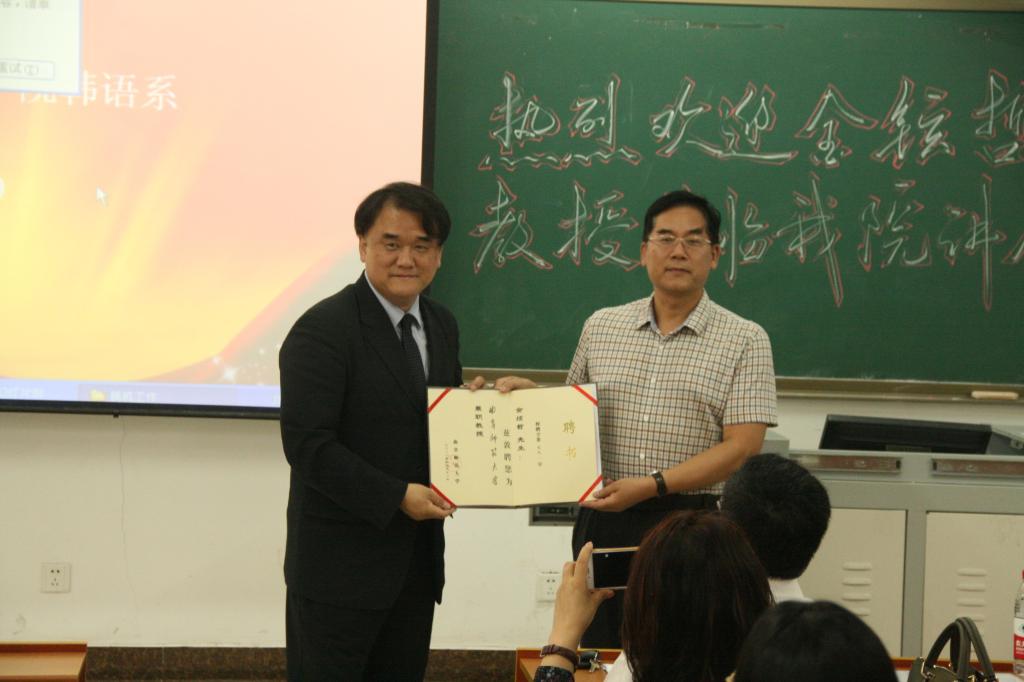 6月19日下午,韩国延世大学金铉哲教授应韩语系邀请前来我院做了题为“韩国的汉语热与‘汉语梦’、‘韩语梦’”的学术讲座。讲座前,卢卫中院长为金铉哲教授颁发了“曲阜师范大学兼职教授”聘书,聘任仪式由夏云副院长主持。讲座由韩语系主任金东国博士主持,我院韩语系全体师生、山东外国语职业学院韩语系部分老师以及我院周统权教授、杨建华副教授参加讲座,并认真听取了金教授的报告。