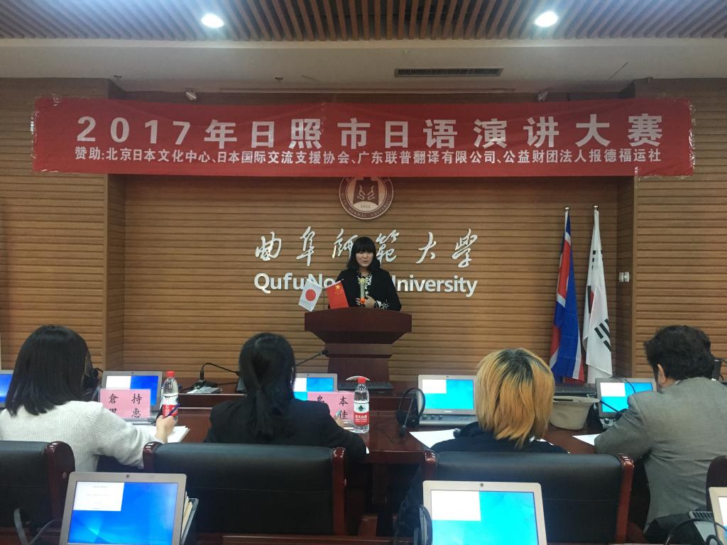 主办的2017年日照市日语演讲大赛在曲阜师范大学同传实验室圆满地落下了帷幕。大赛邀请了山东外国语职业学院日本外教三好晓子、岛本知佳、清水智和高天亮教授,我院日本外教安河内义晴、仓持里惠和徐凤副教授担任评委。我院副院长宋晓凯博士在致辞中向各位评委表示感谢,并祝愿选手们赛出成绩赛出水平,互相学习,共同进步。