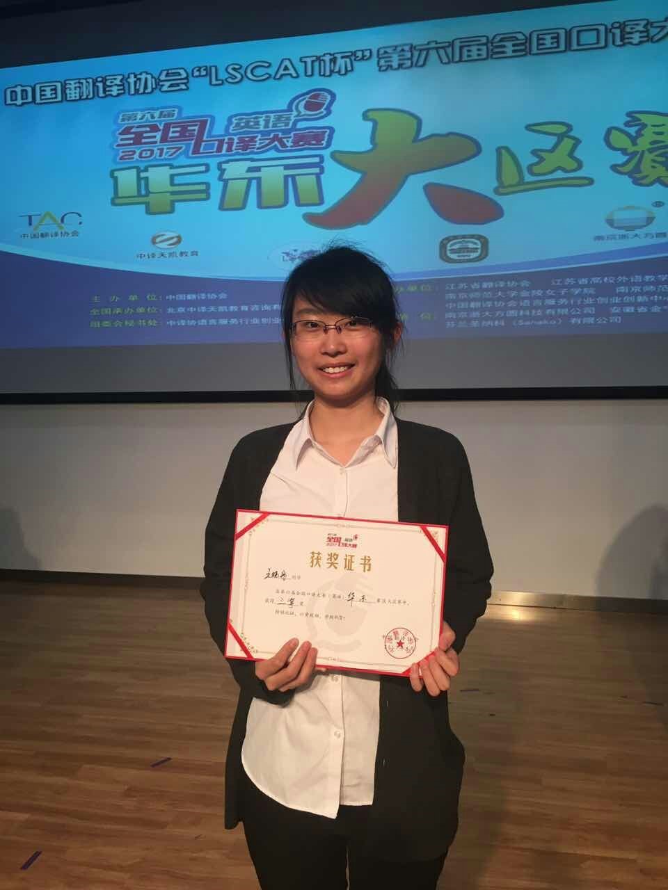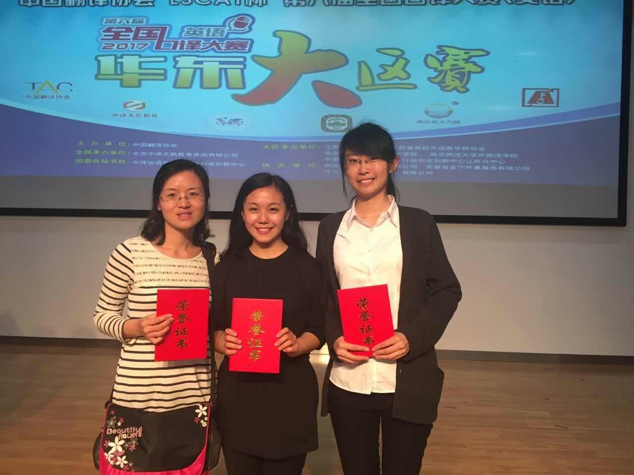大赛分设英译中与中译英两个环节,要求选手听到原文音频后,借助笔记进行即时口译。面对激烈竞争,我院两名学子勇于争先,指导老师及时跟进,最终取得了优异的成绩。王晓彤、赵梦依两名选手均获华东赛区三等奖,带队老师顾晓燕荣获优秀指导教师奖。