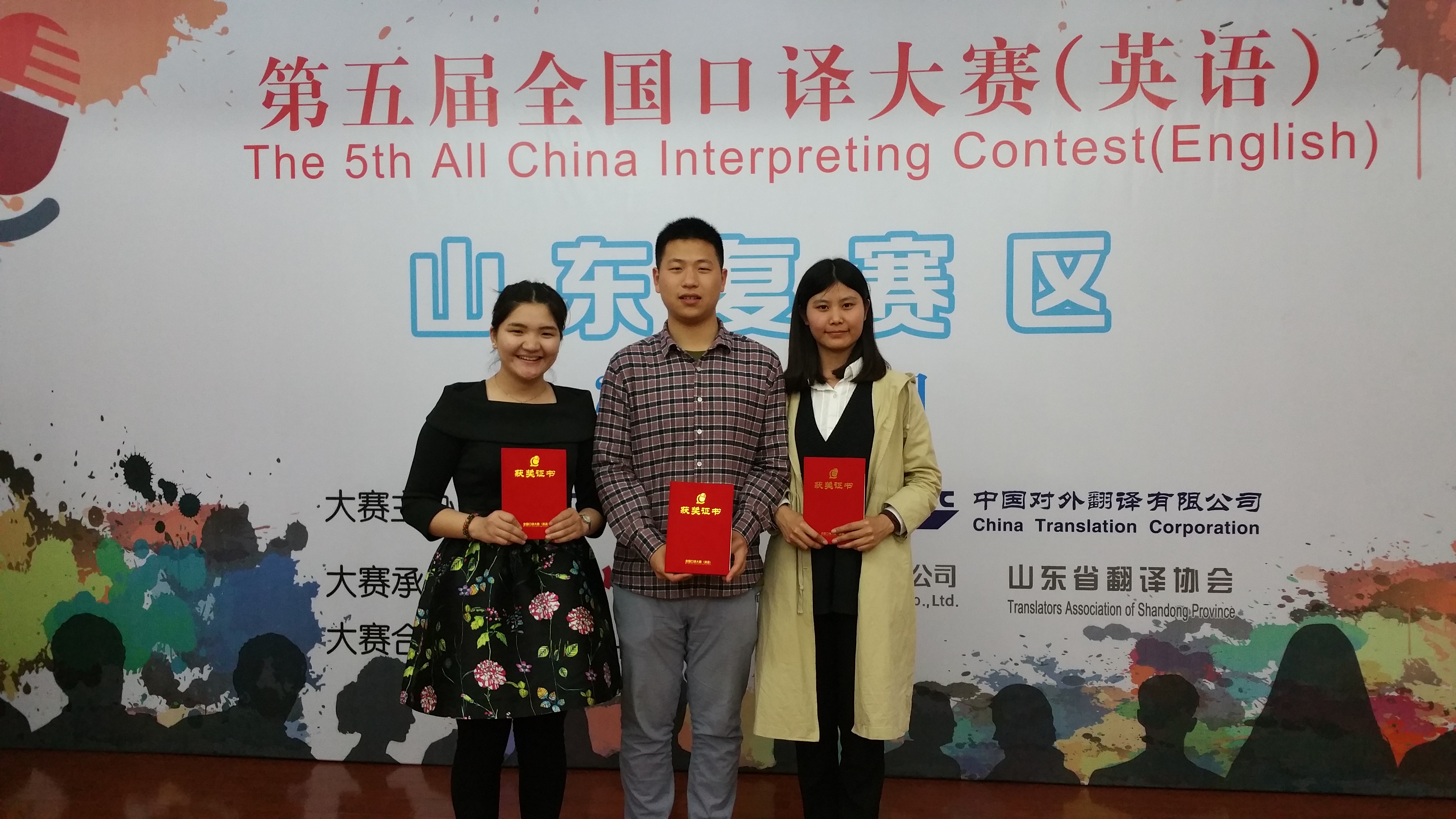 本次比赛吸引了包括山东大学、中国海洋大学、青岛科技大学、曲阜师范大学等省内20多所高校的71名选手参与其中。赛程分为英译汉与汉译英交替传译两部分,充分考验译者的双语能力。经过了前期的选拔和培训,面对高难度的比赛题目和实力雄厚的对手,三位同学凭借着扎实的双语功底、流畅的句式和清晰的逻辑思维,加之自信的台风,获得了山东省优秀奖的好成绩。