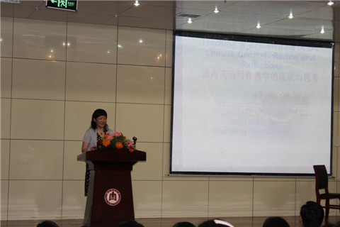 报告中,王教授围绕国内英语写作教学的调研情况展开问题分析与对策研究。王教授在向大家阐明了写作的重要性的基础上,把中国与美国的写作教学情况进行了比较,指出了国内与国外的写作教学现状与差距。同时,王教授还向大家详细介绍了写作这门课程的分类以及它们不同的特点,指出了作为一个专业英语教师应具备哪些能力和教学方法,并针对英语写作提出许多建设性建议,使老师和同学们获益匪浅。