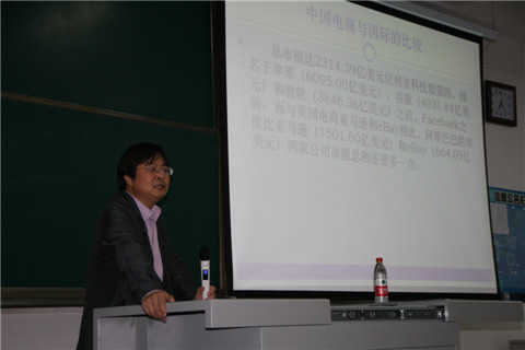 讲座伊始,刘刚副教授以阿里上市的新闻引入了“电商时代”的话题,将中国电商与美国电商的生存环境进行了比较。同时,介绍了美国的新经济与互联网泡沫,深刻剖析了中国电商“反超”的原因:低劳动成本与中小企业的分散生产、庞大的国内市场、中国土地供应与政商模式、税收体制等。随后,刘刚副教授讲解了供应链问题及中国制造的优势,提出了时间与利润的关系,并就如何提高周转率发表了自己的见解。