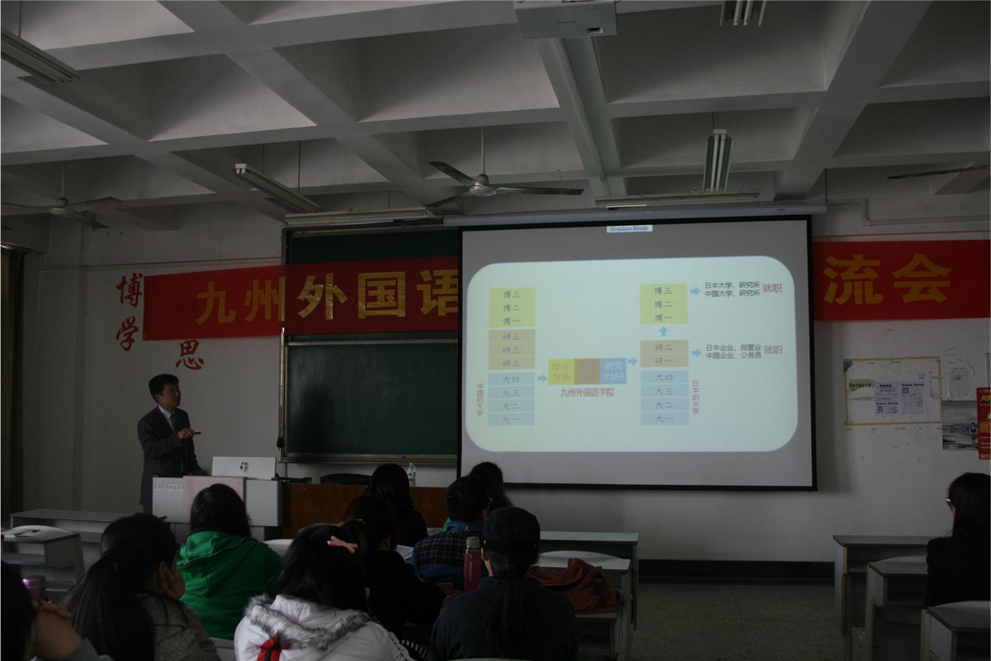 会议伊始,闫萍副教授首先介绍了位于福冈的九州外国语学院留学的历史,以及学院目前面向本科生的留学项目,日本九州外国语学院具有直接代理留学生办理来日本留学手续的资质,已有近千名的各国留学生通过九州外国语学院的考研预备教育,考入了日本的东京大学研究生院、京都大学研究生院、名古屋大学研究生院等日本著名院校。随后,董爽老师系统地为与会人员讲解了九州外国语学院的地理位置、办学历史以及未来面向本科生的留学项目计划,及中日两国研究生应试的异同。他表示希望同学们珍惜此次留学机会,在日期间努力学习并能有所收获。
