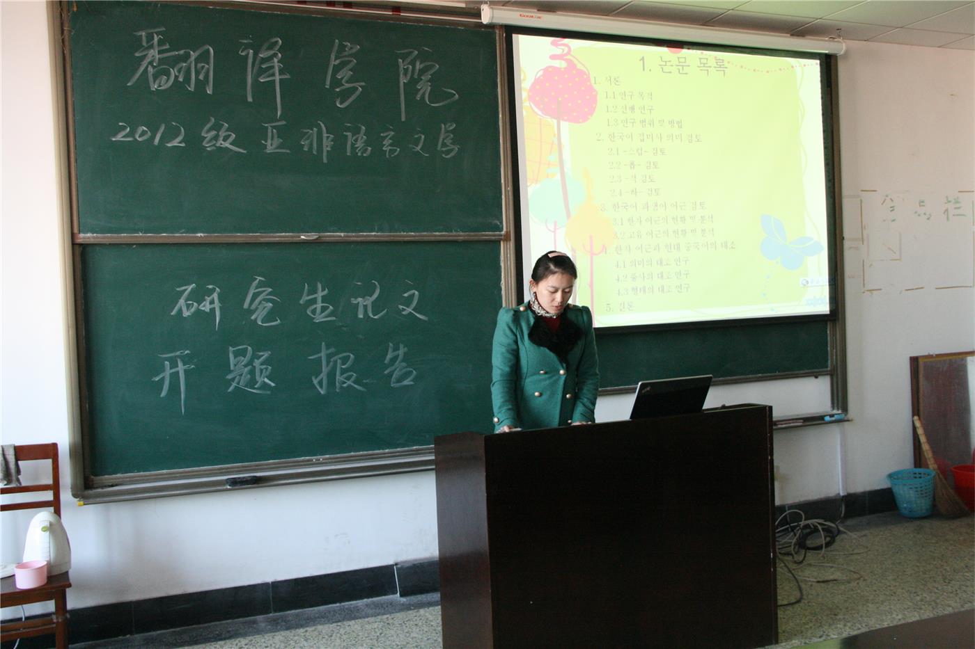 2012级亚非语言文学专业硕士学位论文开题报告会于日照校区C703举行。此次开题报告会的开题委员会主席为我院韩国语系主任金东国副教授,韩国语系副教授卢正爱及讲师金红英、白璐、章科佳作为开题委员会成员出席了此次报告会。李彦红作为开题秘书主持了此次开题报告会。 开题报告伊始,金东国副教授首先介绍了开题委员会的各位成员,明确了本次开题报告的总体要求及程序内容,随后开题报告会正式开始。