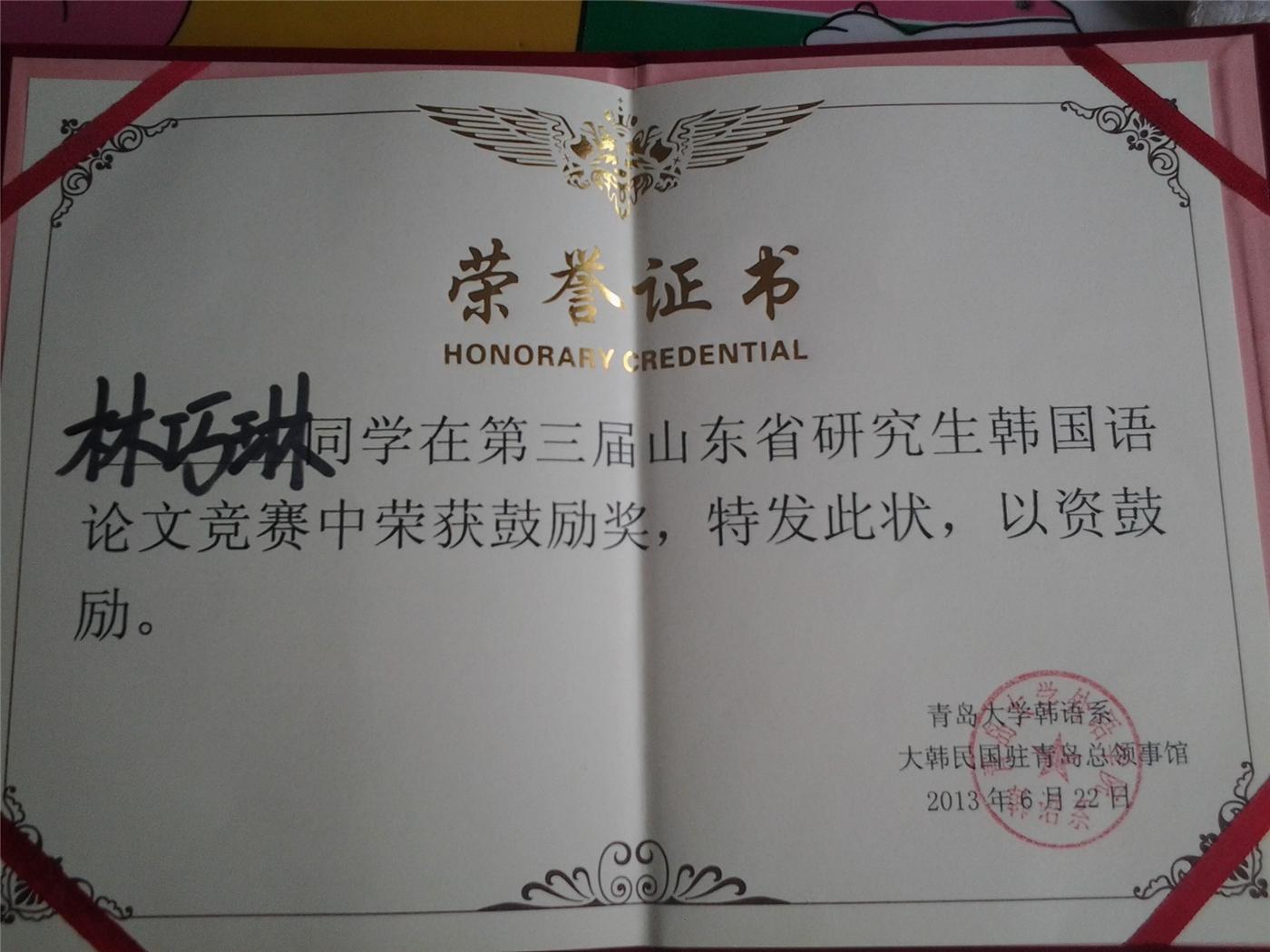 我校今年首次参加省级研究生韩语论文竞赛。本次大会取得的良好成绩证明韩国语系自建系以来已经取得了长足的发展与进步,也是对我院研究生培养质量的检验与肯定。希望韩国语系今后再接再厉,蓬勃发展,再创辉煌。