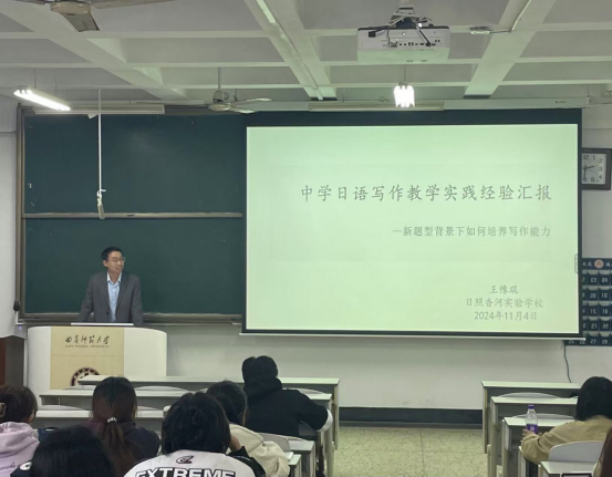 为了深化日语师范生对中学日语写作教学的理解,11月4日学院邀请日照香河实验学校王豫琨老师来校分享教学经验。讲座由日语系刘珊博士主持,2022级日语师范生全员参加。
