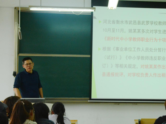 为让师德教育更具实效性,宋晓凯通过“正面榜样 + 反面警示”的案例对比方式,既分享了优秀教师扎根教育、关爱学生的感人事迹,展现师德师风的正能量,也结合教育领域违规违纪典型案例,深刻剖析失德失范行为对学生、学校及教育行业的危害,让同学们直观认识到“坚守师德底线”的重要性与必要性,进一步强化职业道德敬畏心。