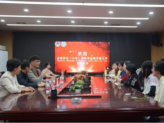 顺利开展必洛怀达(山东)国际供应链有限公司实习宣讲。学院党委副书记岳峰、辅导员刘明、公司总经理时海滨出席,2022级、2023级部分商务英语专业学生参与。